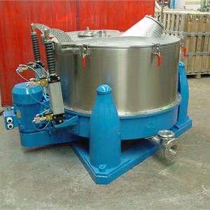 Centrifuga a cestello ad albero verticale usata con scarico dall'alto con sacco montato su tre piedi (con tiranti e molle di compressione).